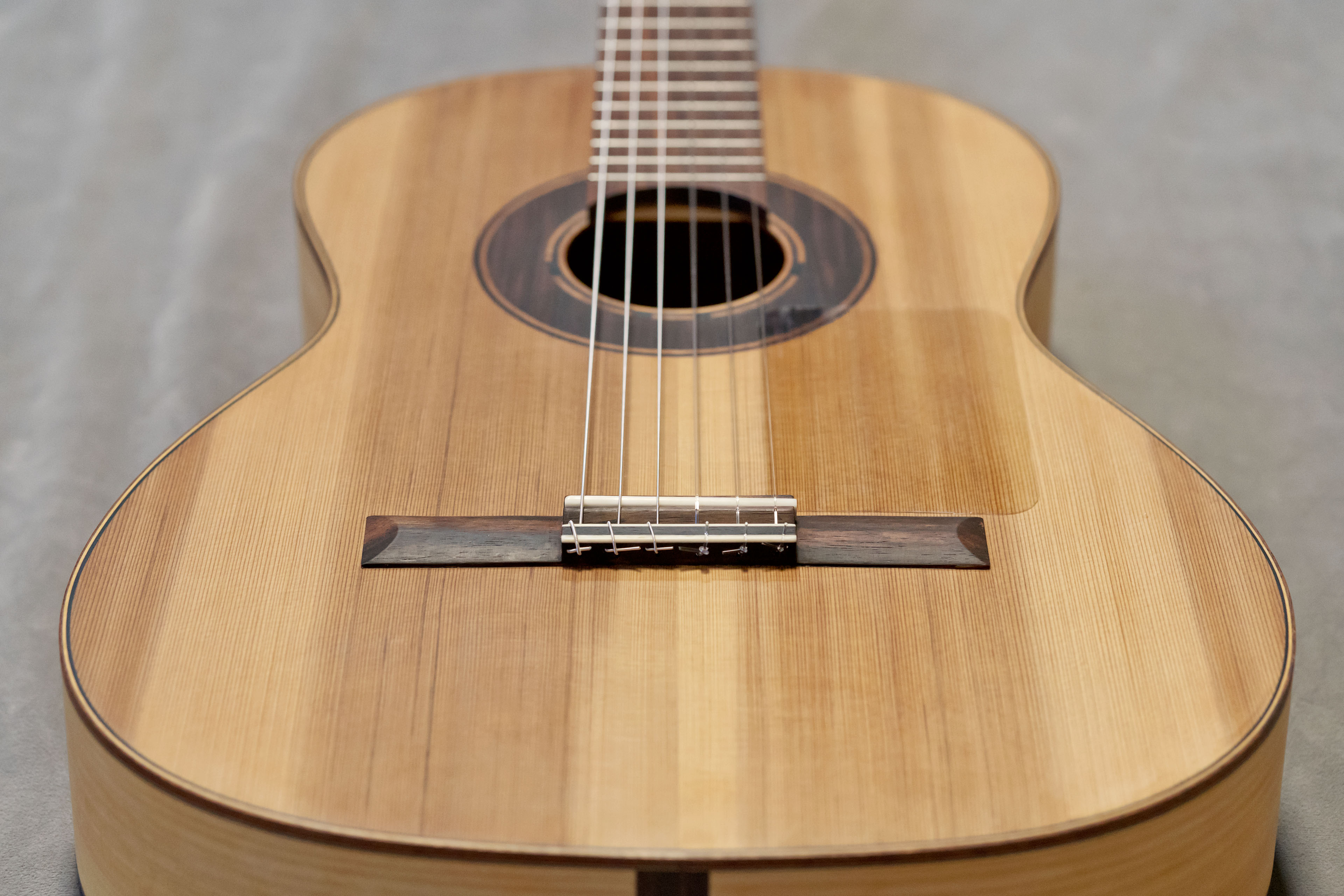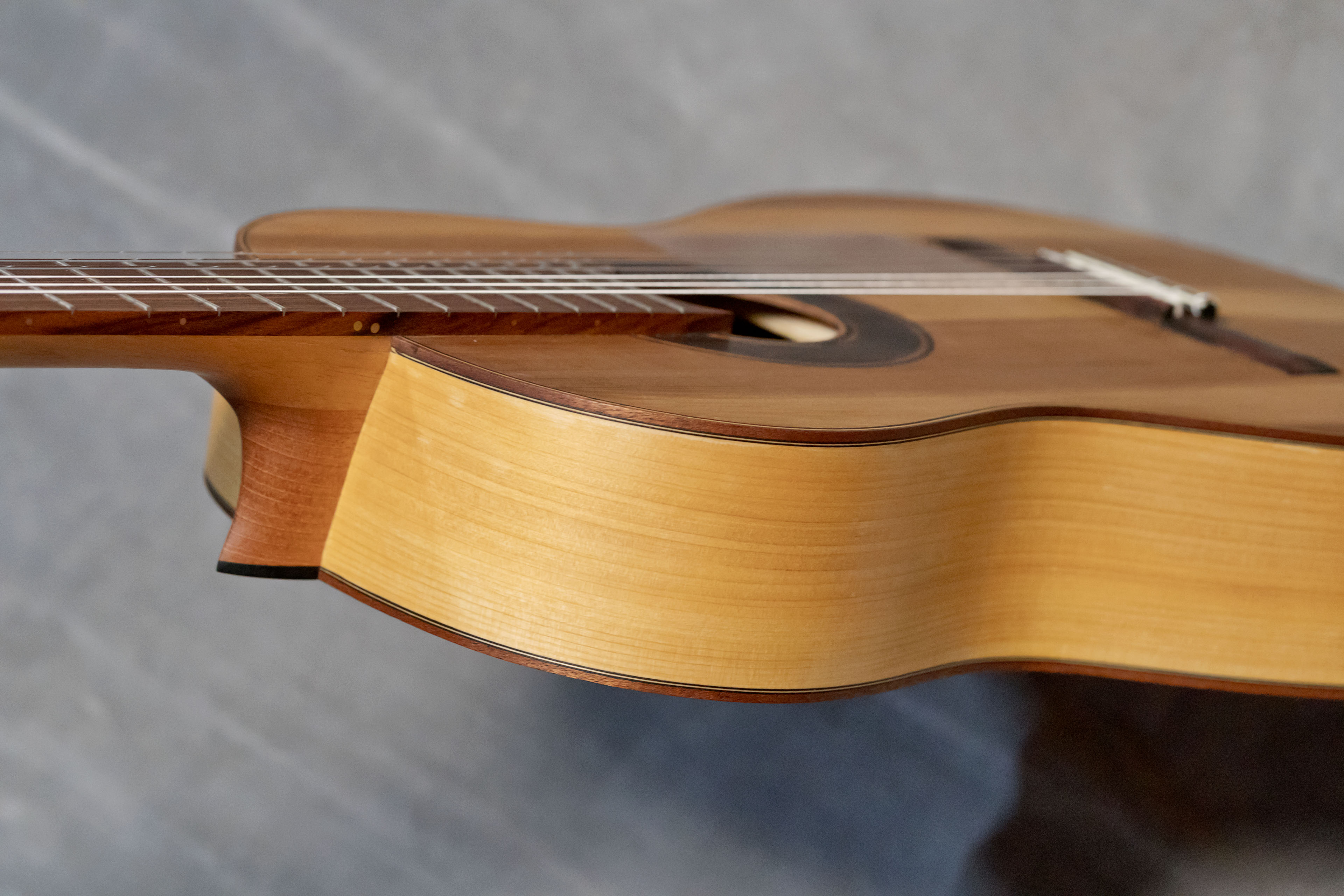 La guitare est construite avec un barrage flamenco traditionnel à 5 brins. L’action est réglée basse, typiquement flamenca, afin de privilégier la rapidité de jeu et les techniques percussives. Un golpeador transparent est posé pour protéger la table.