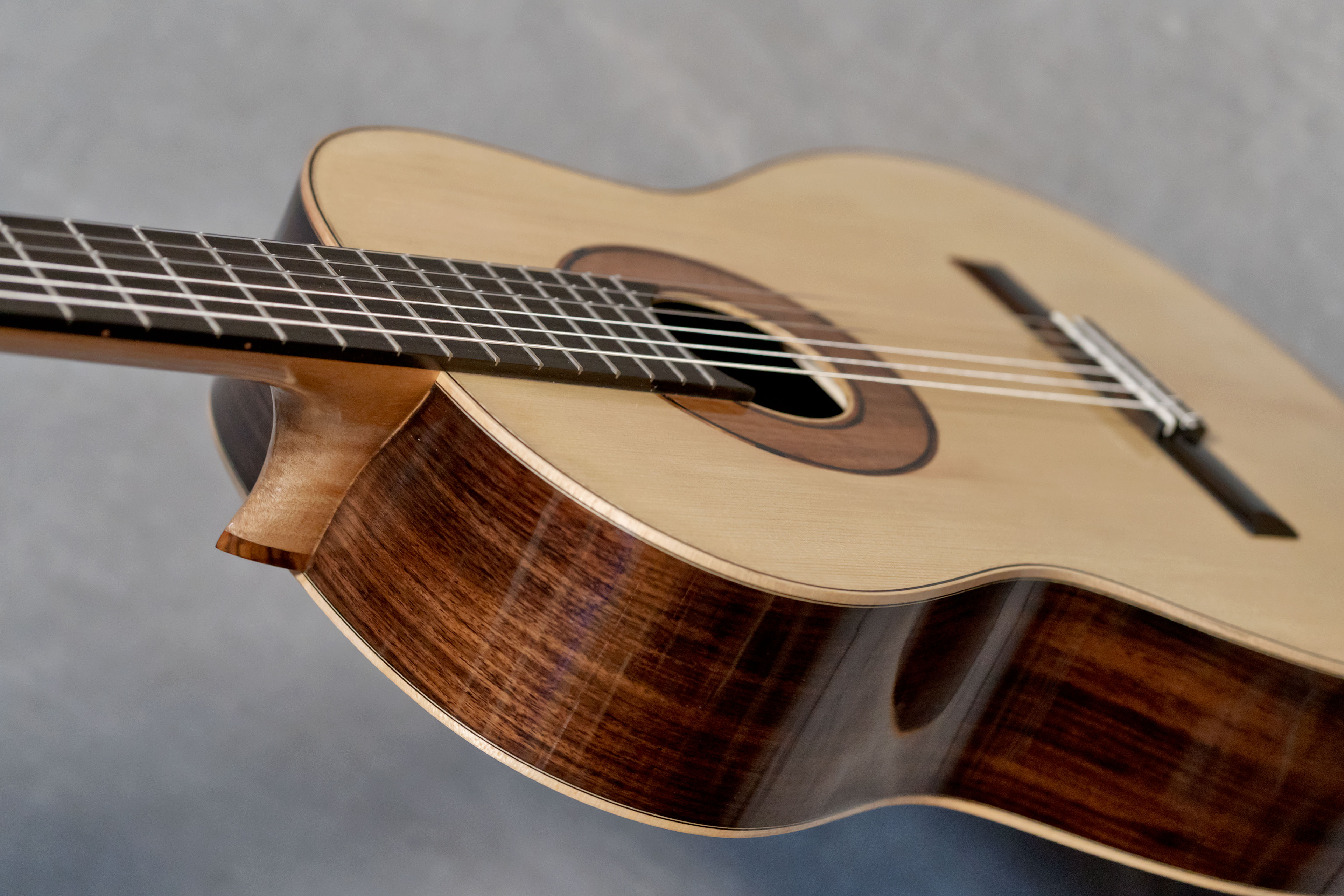 Les bois utilisés pour ce modèle ont été choisis pour leurs qualités esthétiques et acoustiques. La table est en épicéa européen : Picea abies, reconnu pour sa finesse de grain, sa dynamique et sa capacité à offrir une large palette de nuances. Le dos et les éclisses sont en palissandre indien : Dalbergia latifolia, apprécié pour la profondeur de ses teintes, la richesse de son veinage et l’élégance visuelle qu’il apporte à l’instrument. Le manche est en cedro : Cedrela odorata, offrant stabilité et confort de jeu. La touche est en ébène : Diospyros crassiflora., assurant précision et durabilité. Le chevalet est en ébène de Makassar : Diospyros celebica, dans une configuration à 12 trous, favorisant une transmission efficace des vibrations.