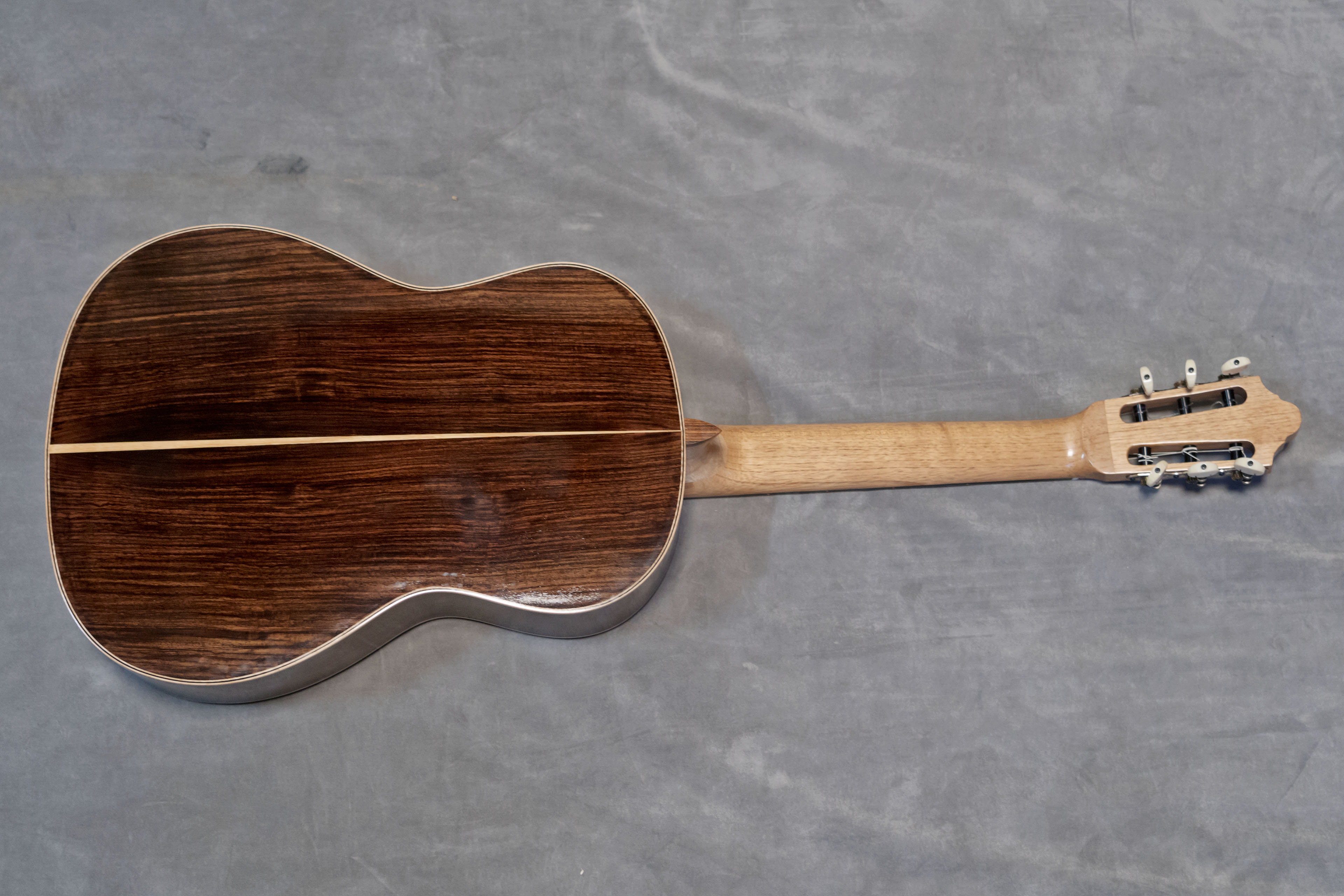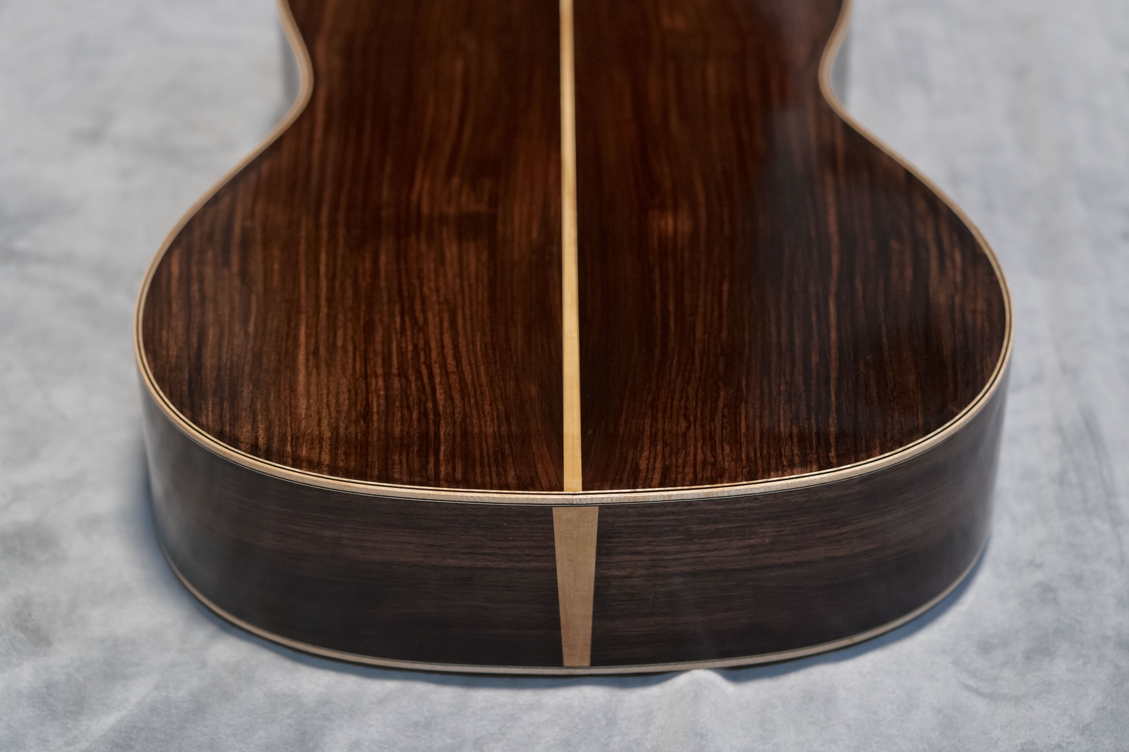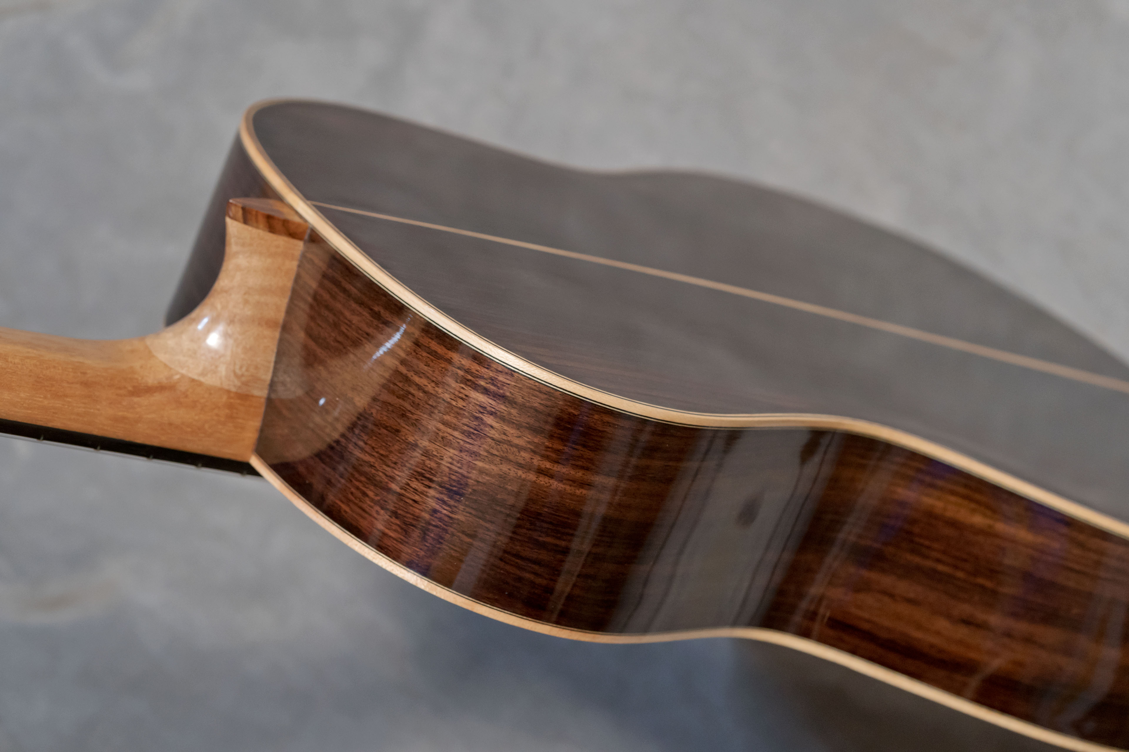 J’ai fait le choix d’une finition à la gomme laque appliquée au tampon, permettant d’obtenir une surface fine et acoustiquement légère, tout en mettant en valeur les bois et leur profondeur visuelle.
