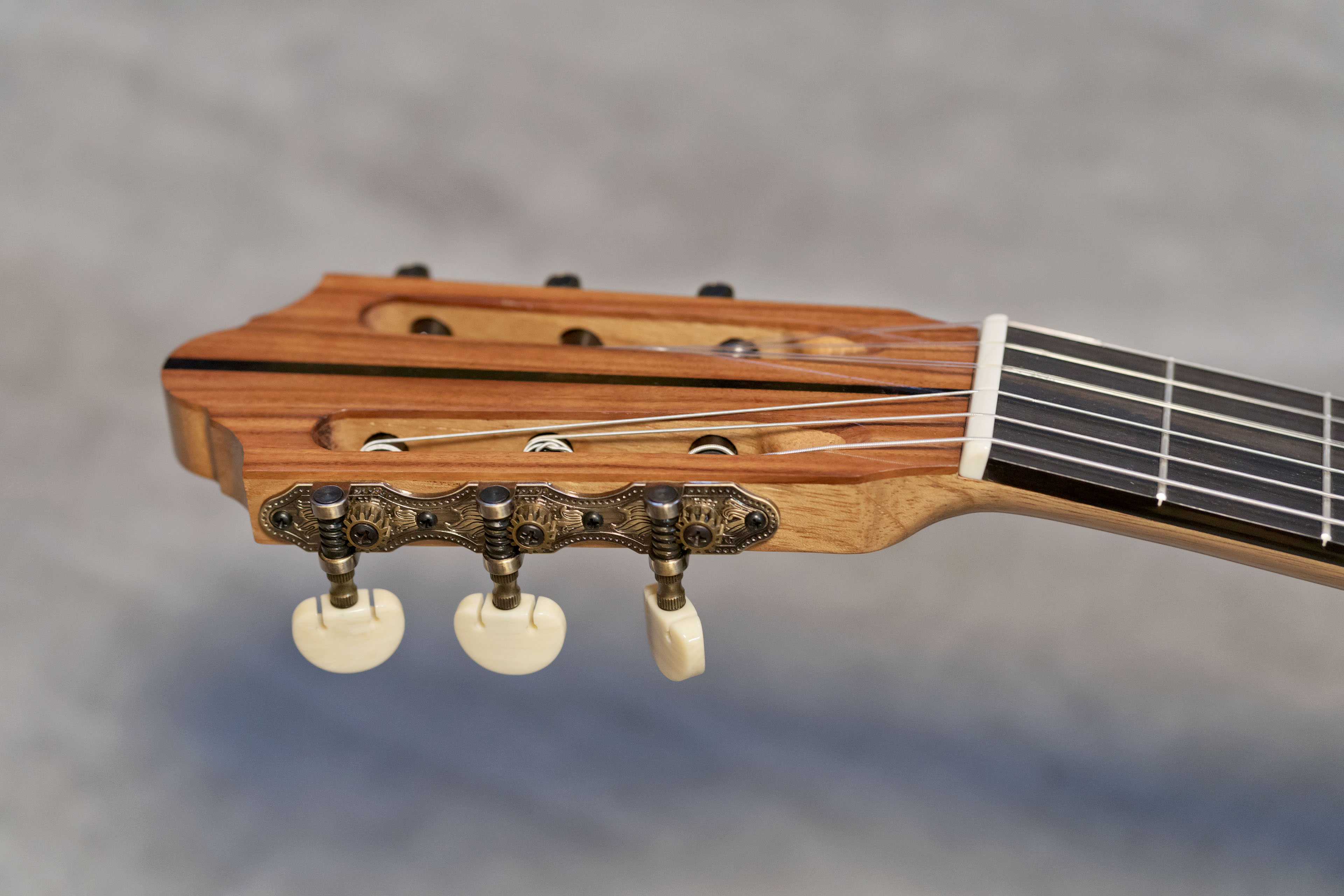 La guitare est construite avec un barrage inspiré des modèles Romanillos. L’action est réglée de manière classique, offrant un équilibre entre confort de jeu et développement sonore. Le diapason est de 650 mm, avec une largeur au sillet de tête de 52 mm.